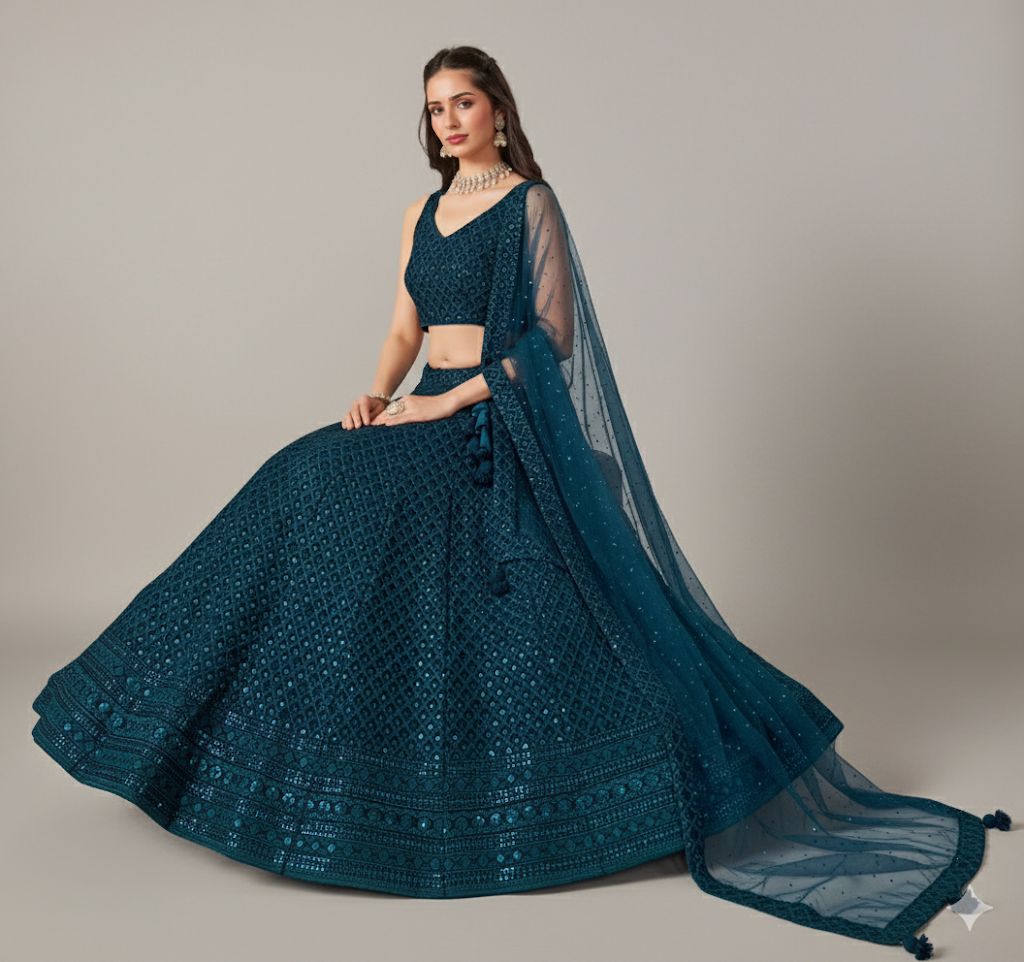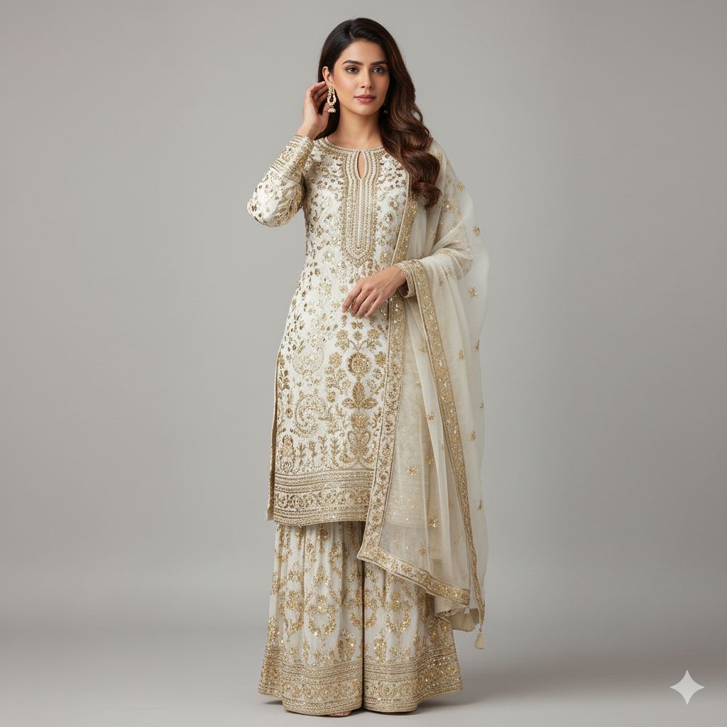 From our factory in India, each design is handcrafted and meticulously detailed, blending traditional weaving techniques with contemporary silhouettes. Whether it’s a delicate organza saree, a regal bridal lehenga, or a festive sharara — every piece is made to celebrate womanhood in its purest, most graceful form.